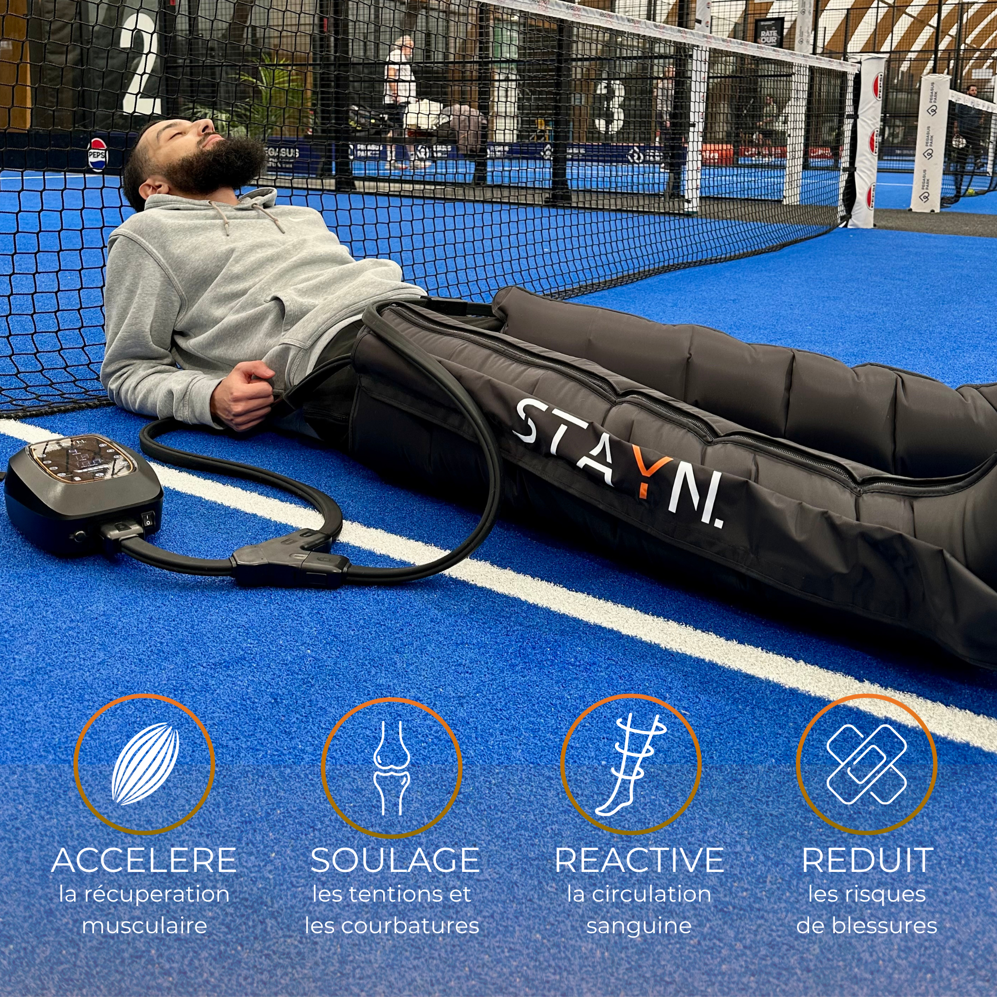 Le dispositif STAYN utilise des manchons gonflables (chambres à air) qui se remplissent puis se vident selon un cycle programmable. Cette séquence simule un « massage par compression » qui stimule le retour veineux, réduit l’accumulation de métabolites (ex : acide lactique), et favorise une sensation de jambes plus légères après entraînement.